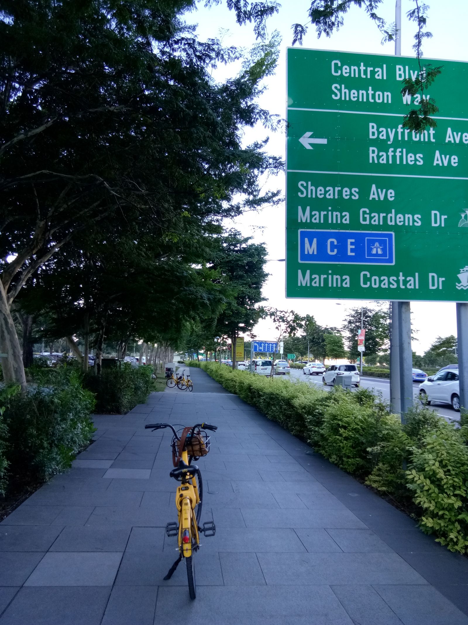 ฉันใช้บริการจักรยาน Ofo จักรยานสาธารณะเช่า ที่จอดให้บริการอยู่ทุกสถานีรถไฟฟ้าและย่านสำคัญๆทั่วเมือง หลังจากเดินออกจากสถานี City Hall ฉันปั่นจักรยานไปบนทางเท้า-ทางจักรยานที่ใช้ร่วมกัน มาจอด ณ จุดข้ามไฟเขียว-ไฟแดงบริเวณหัวถนน Stamford (Stamford Road) รอข้ามไปอีกฝั่ง